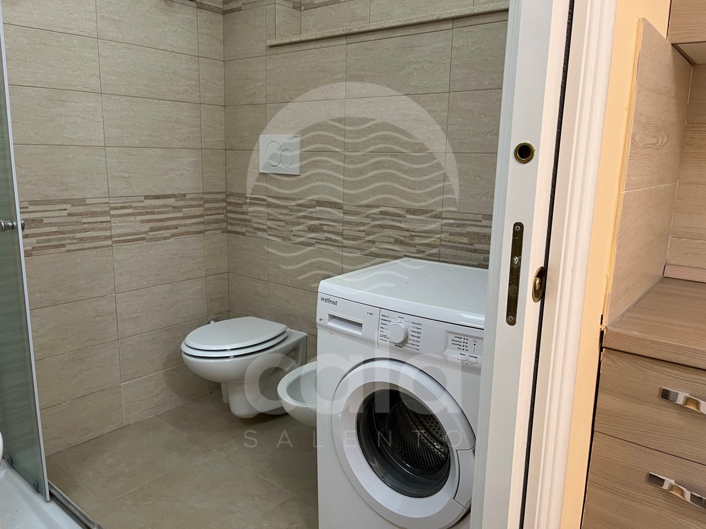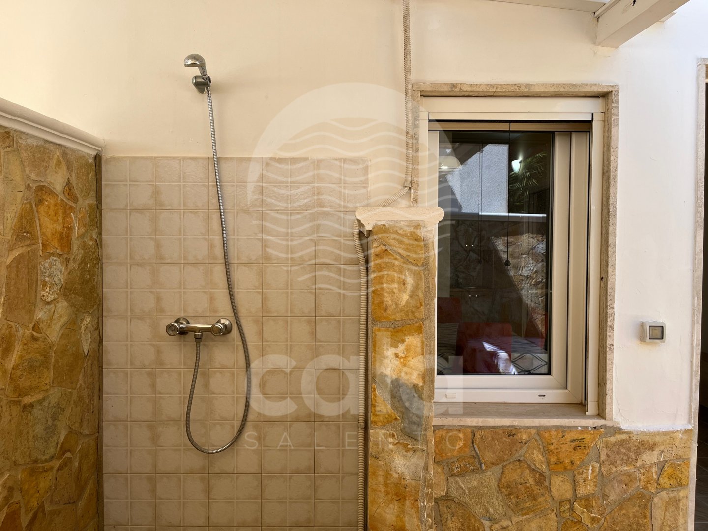 Badezimmer mit allen Annehmlichkeiten, Duschkabine und Waschmaschine.