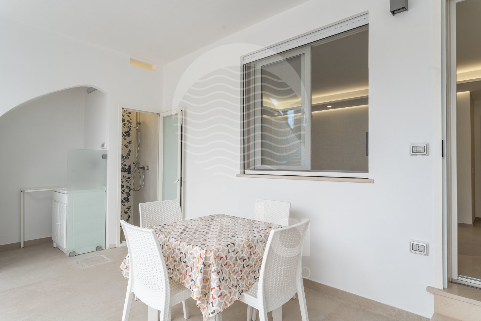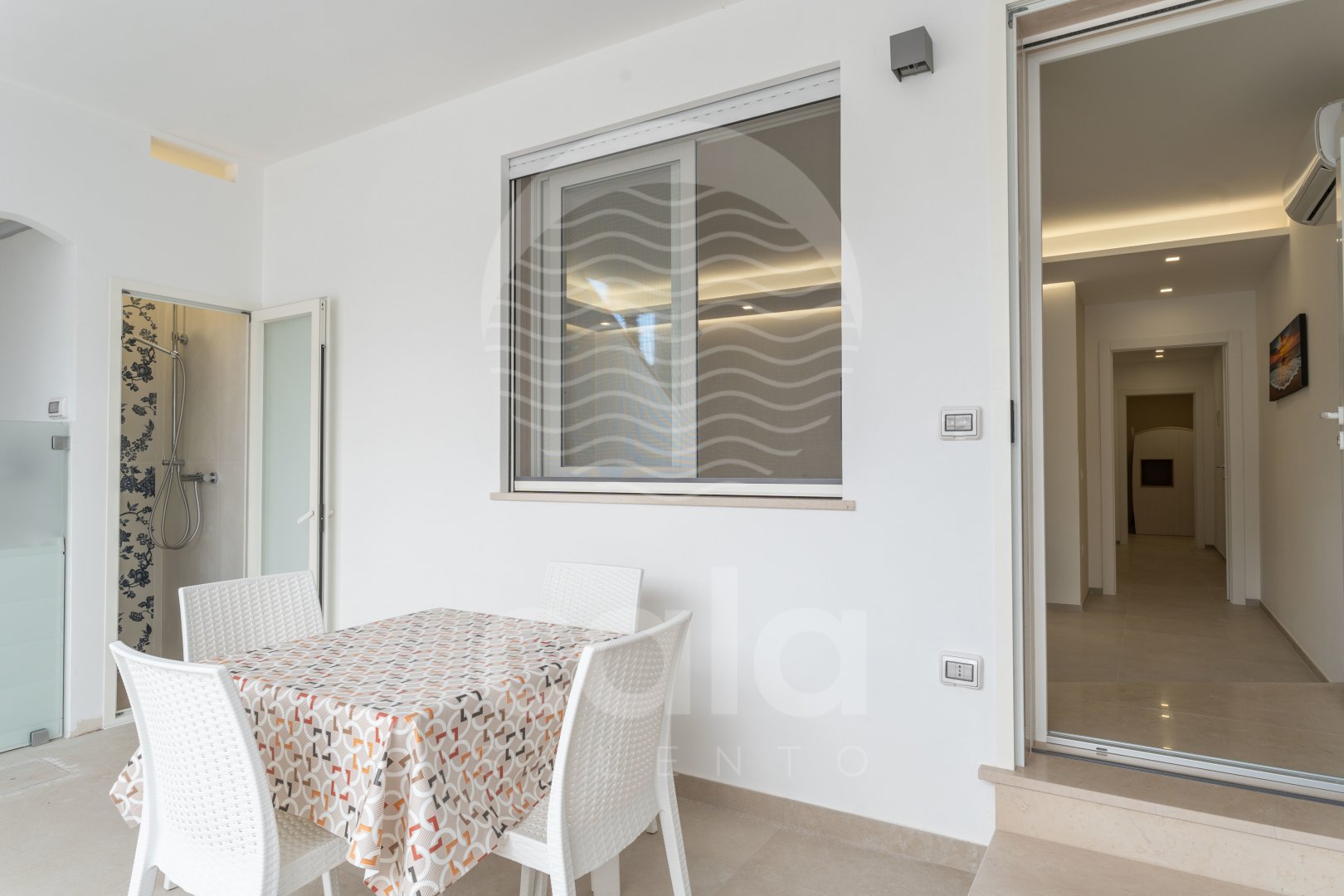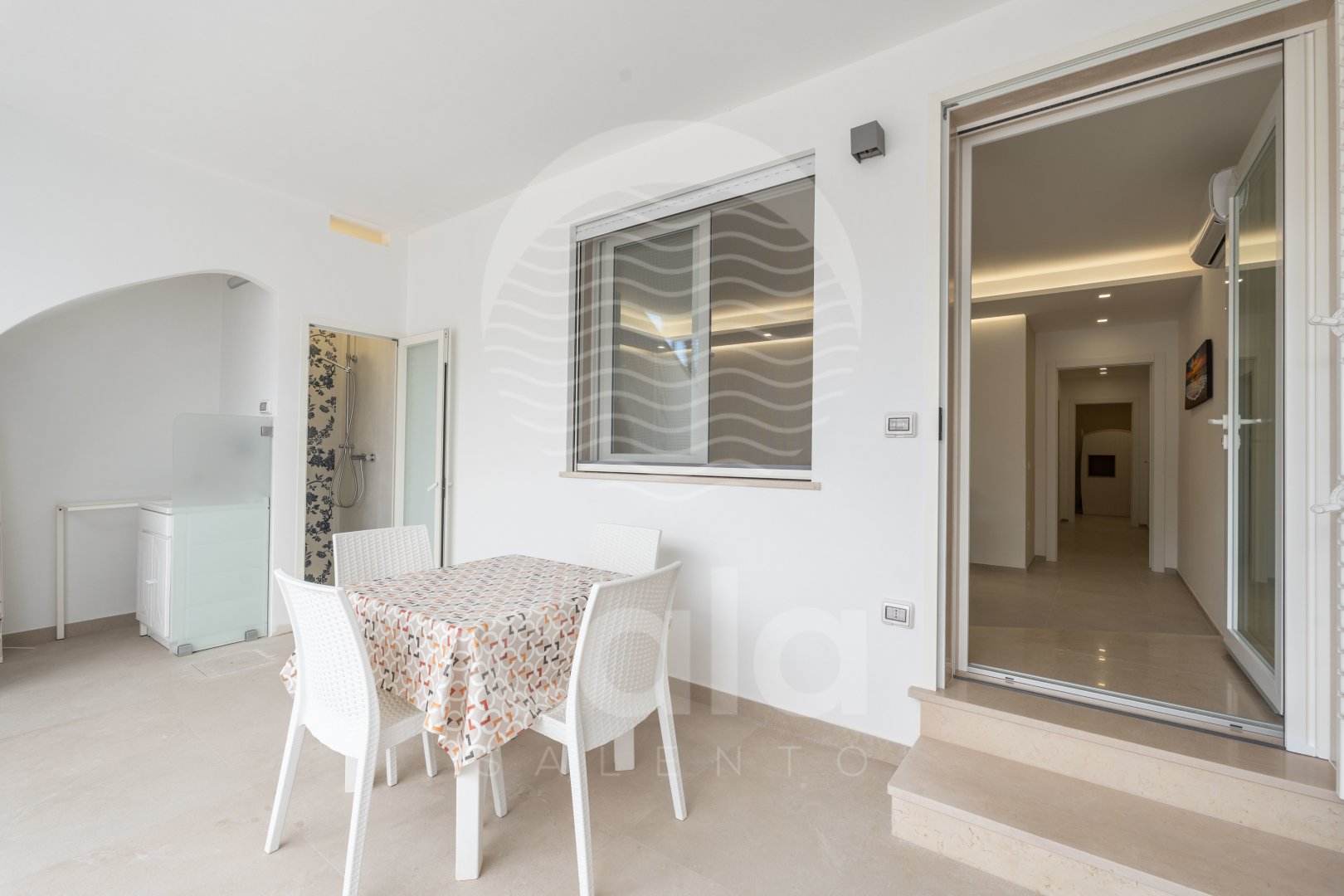 WEITERE AUSSTATTUNG: Außenbereich mit Tisch und Stühlen. Stufe vor der Haustür (siehe Foto). Waschmaschine. Außendusche mit Warmwasser. Fliegengitter. Zwei Parkplätze im Garten. Grill. Wasserversorgung durch Acquedotto Pugliese. Torre Lapillo in 650 m. Porto Cesareo in 5 km. Supermarkt in 100 m.