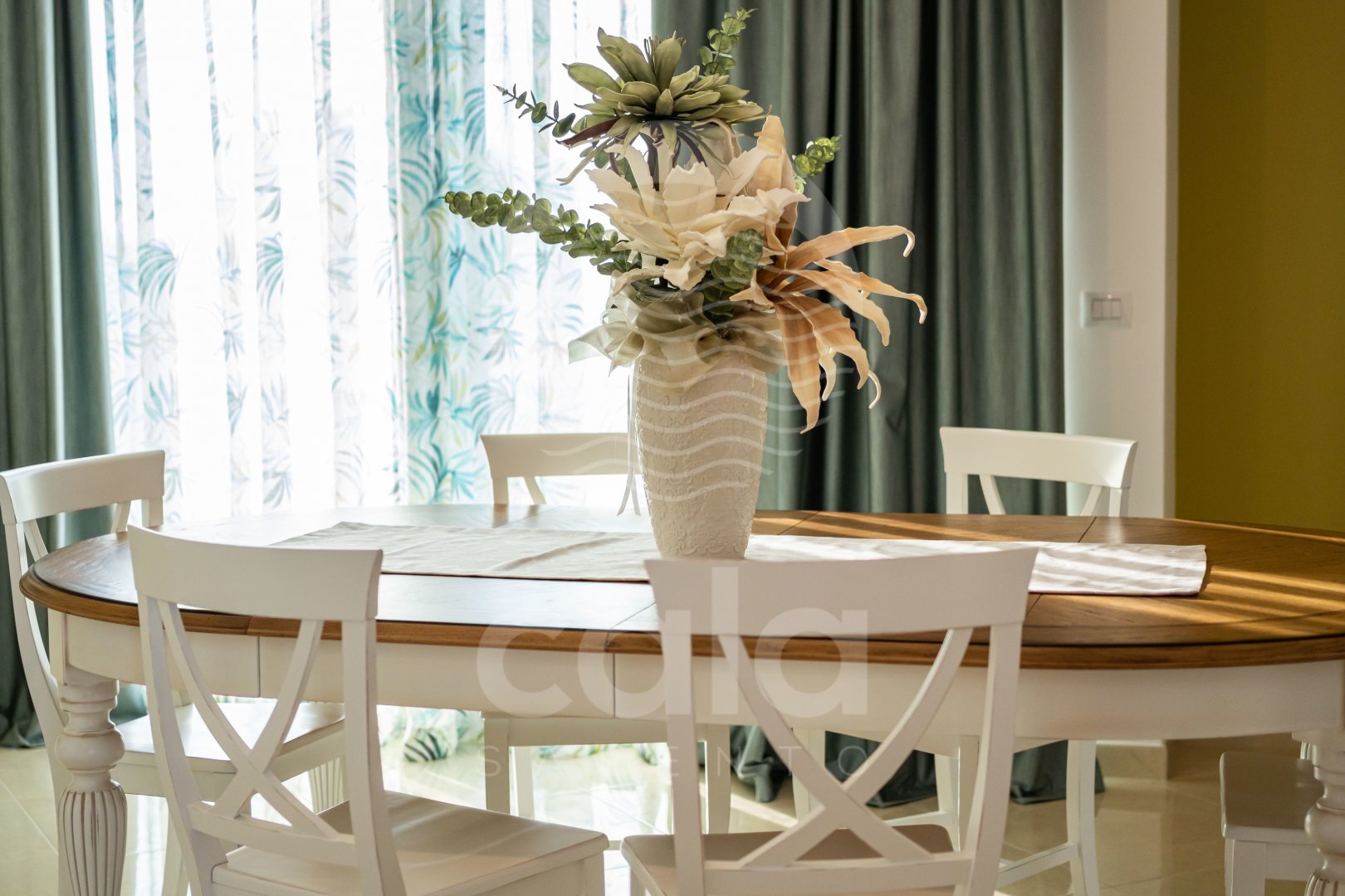 Living Area: The air-conditioned living room is the heart of the villa, providing a welcoming space to relax or enjoy time with family and friends. Comfortably furnished with sofas, a dining table, and a flat-screen TV, it’s the perfect spot to unwind.