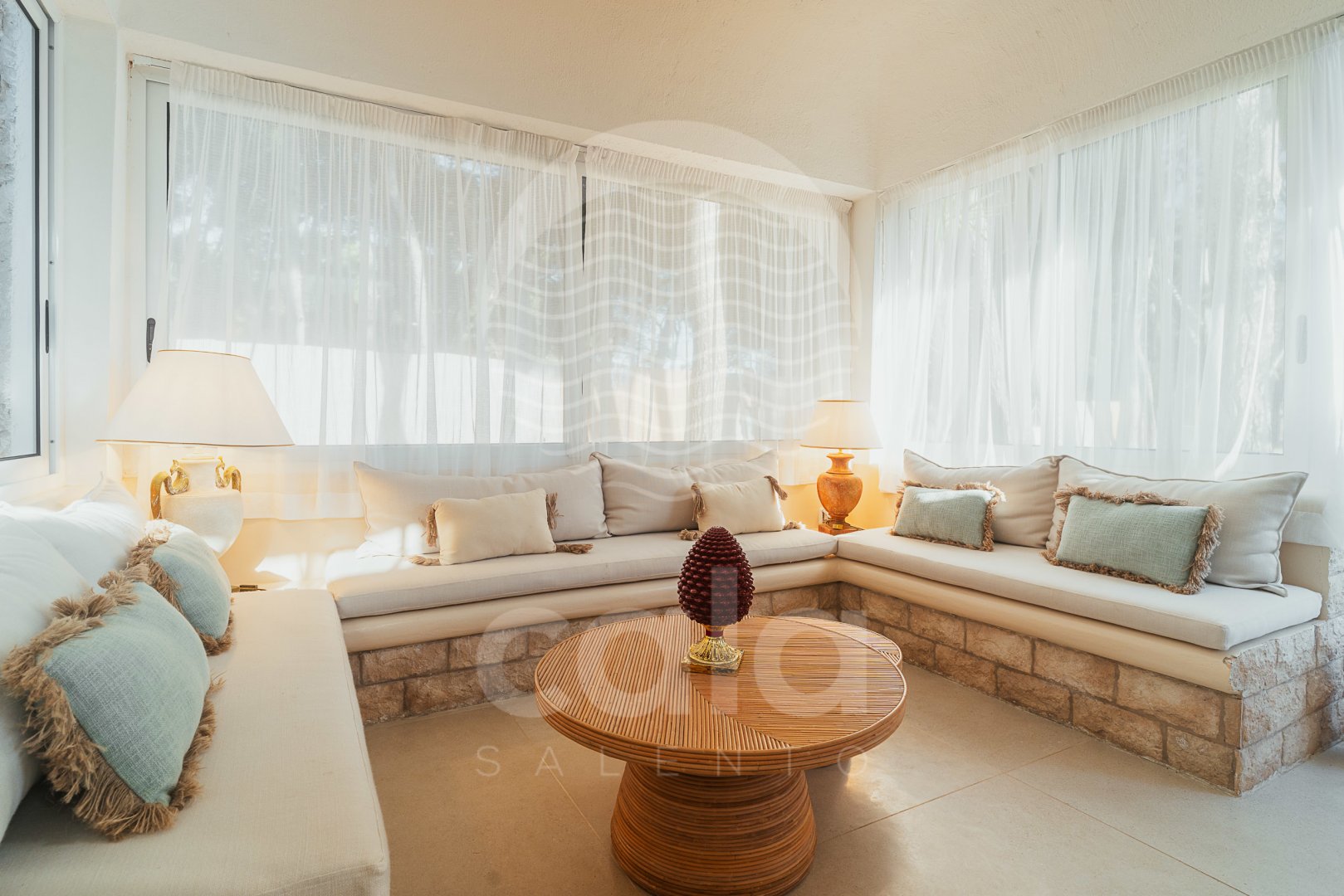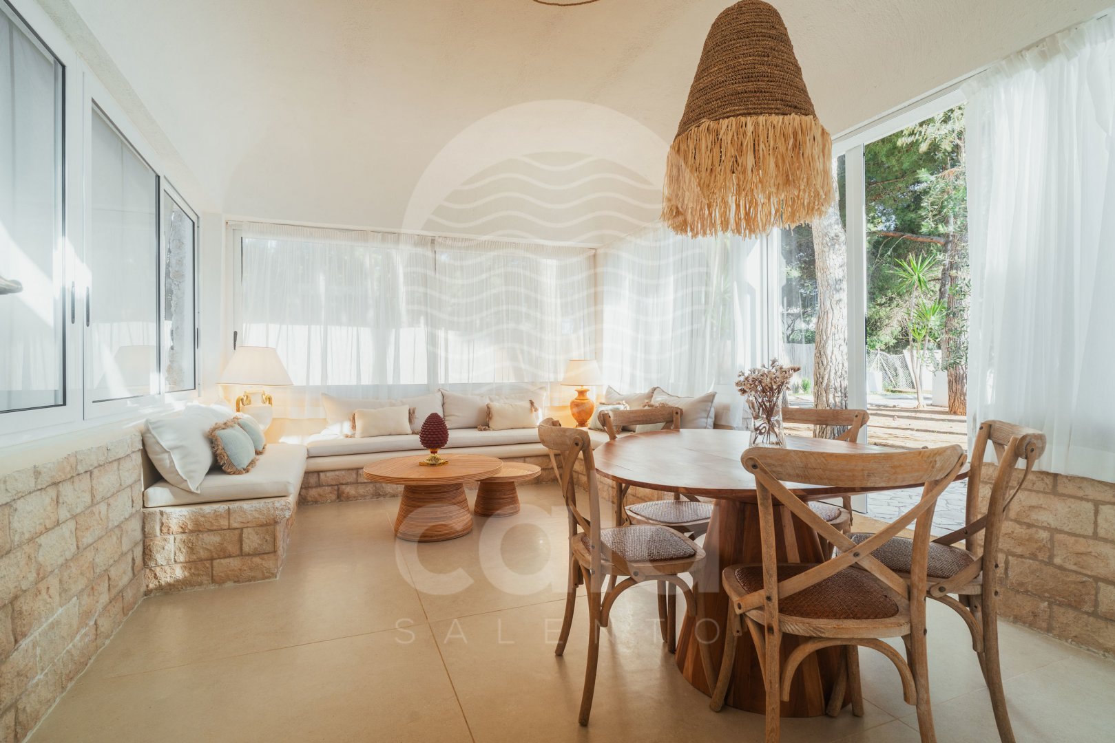 The living area, with large windows overlooking the lush garden, is the heart of the house – an open and welcoming space where natural light highlights every corner, creating a warm and relaxing atmosphere.