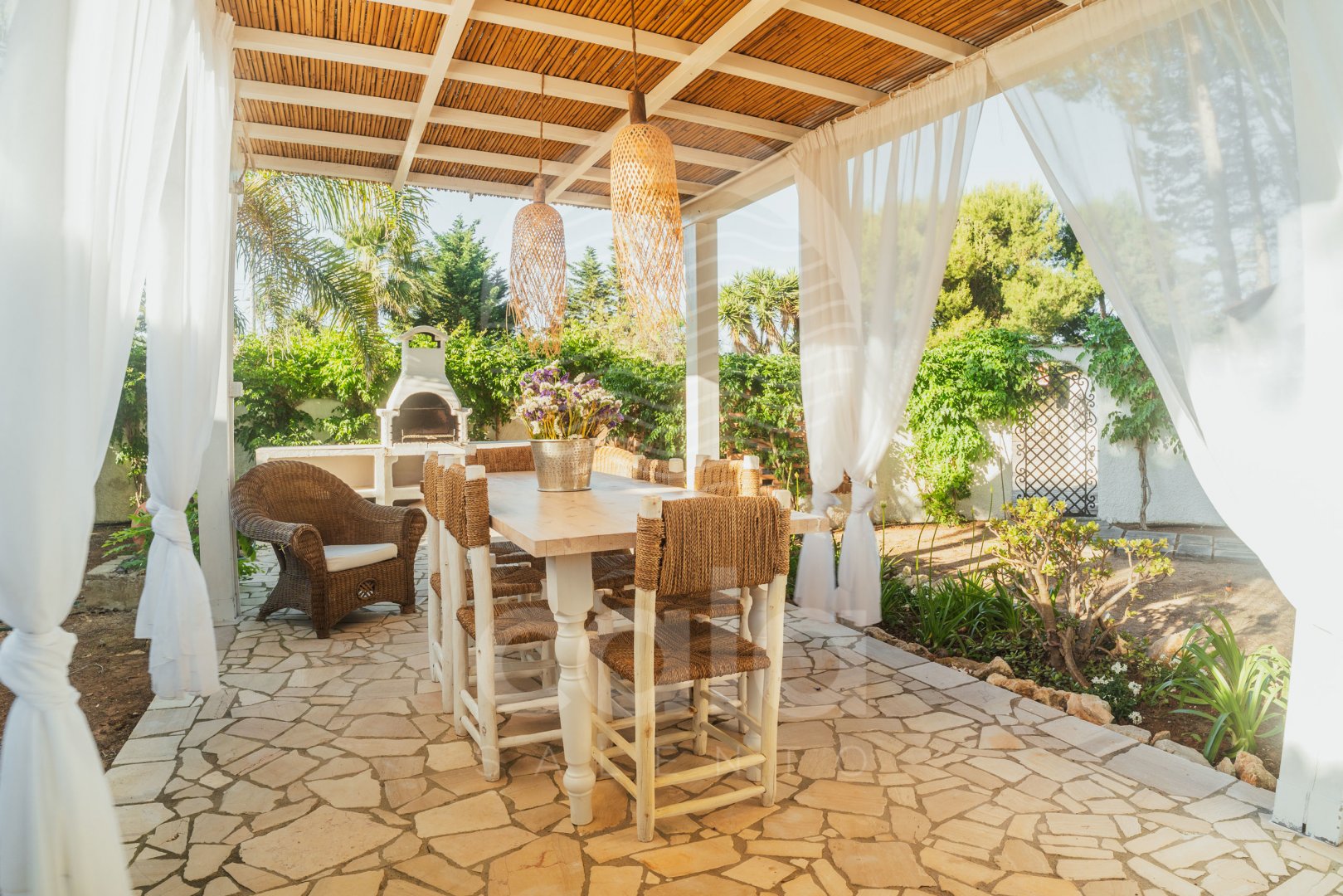OUTDOOR AREA: The trullo features a second kitchen with oven. A gazebo dominates the outdoor space, creating the perfect spot for al fresco meals, fully immersed in nature. Surrounded by lush greenery, it offers a serene and peaceful atmosphere. A stone barbecue is perfect for preparing tasty and convivial grilled meals. This outdoor corner is designed to enhance moments spent outside, where the aroma of food blends with the freshness of nature, creating a warm and relaxing atmosphere. Amid the birdsong and beautiful landscape, every meal becomes a unique experience in an oasis of tranquility.