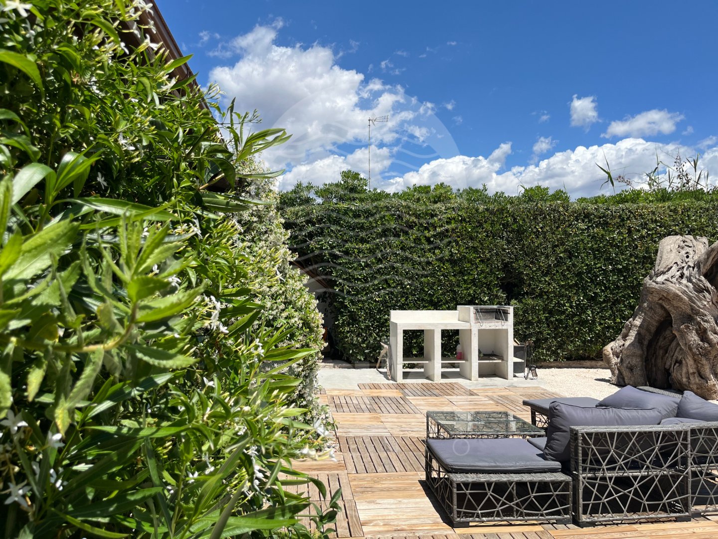 Large furnished veranda with outdoor lounges, dining table, and chairs