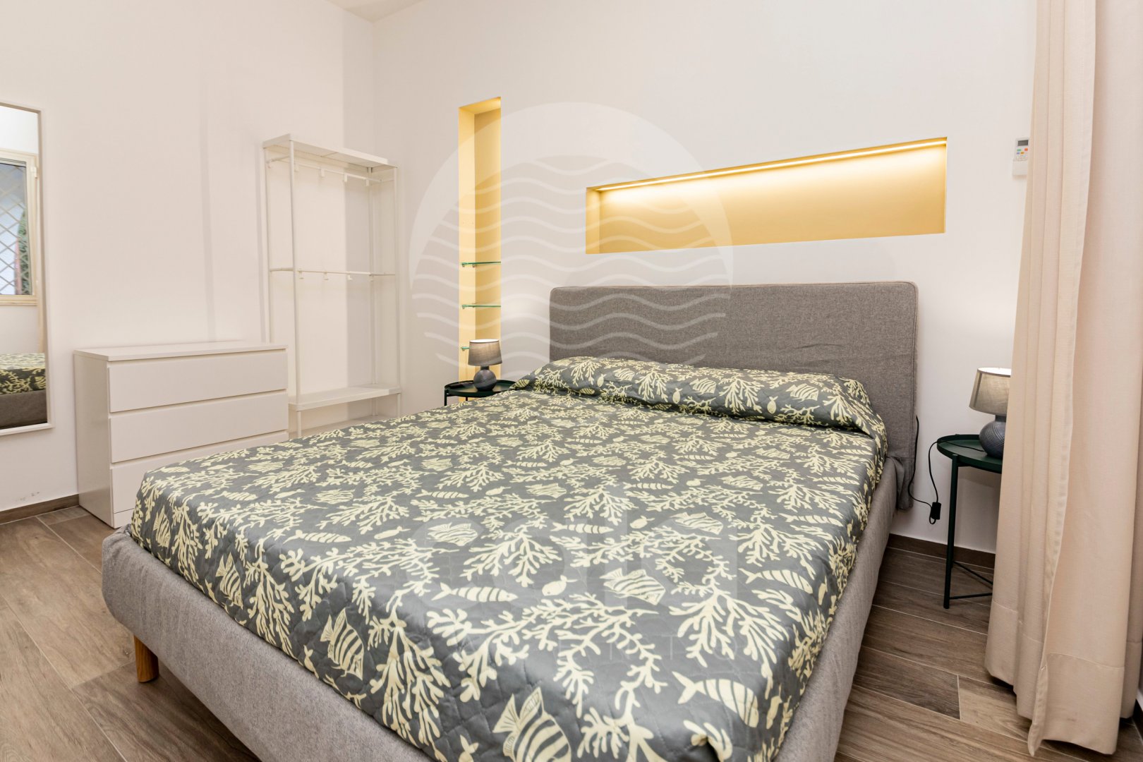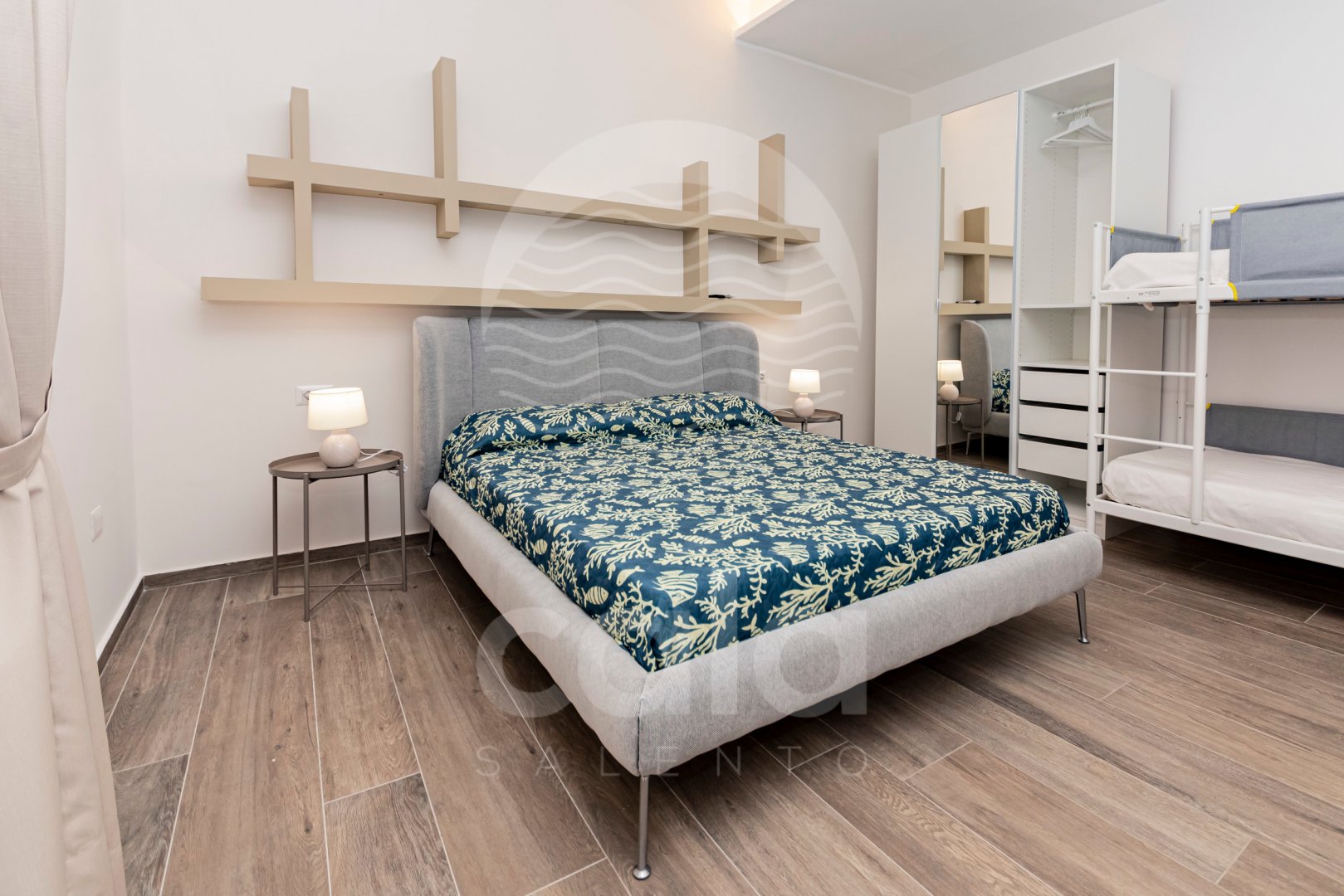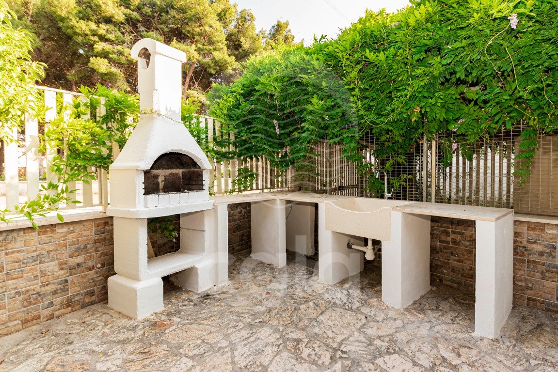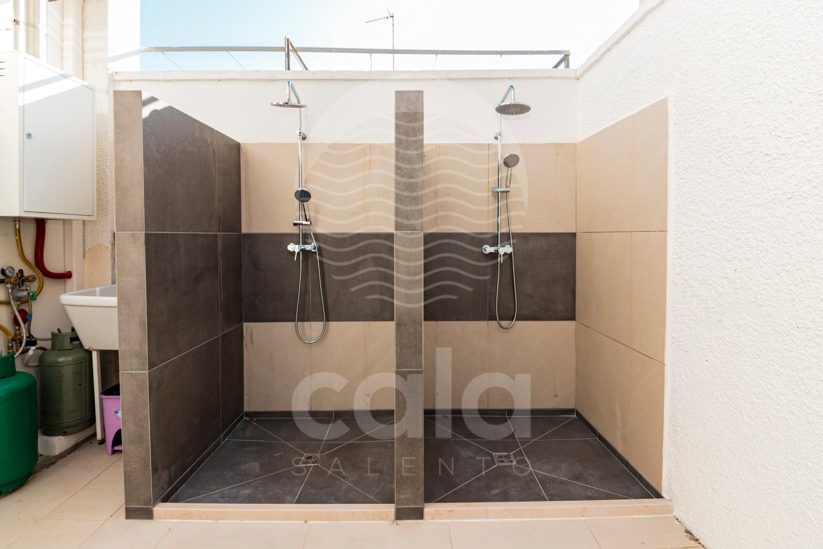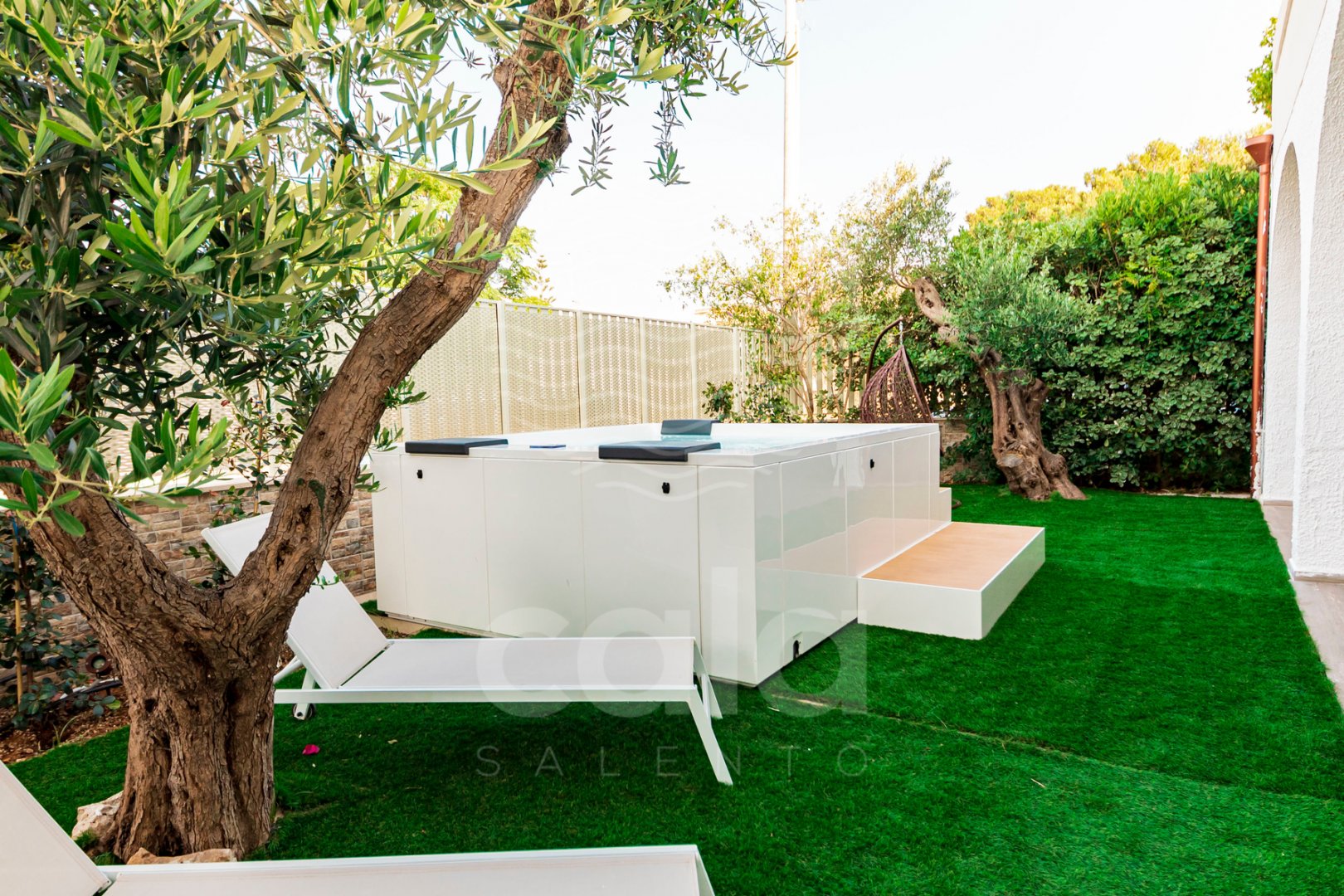 Extras: Mini pool with hydromassage (2.35 x 2.80 x 0.95 m), large furnished verandas with dining table and chairs for al fresco meals, comfortable armchairs, typical Salento garden with olive trees. Two outdoor showers, internal parking for 2–3 cars, stone barbecue, mosquito nets, blackout curtains, Wi-Fi. Pets allowed.