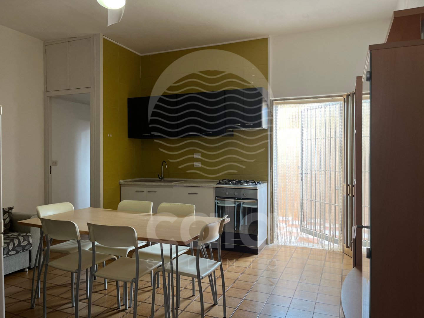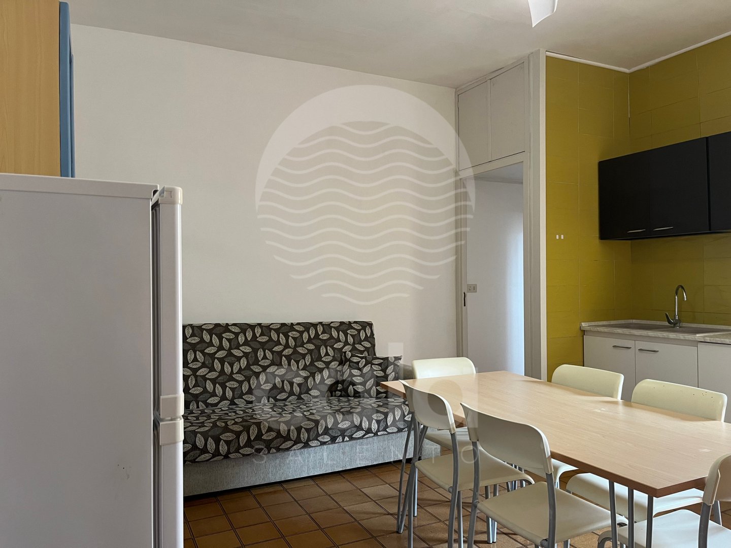 LIVING AREA: living room with sofa bed, dining tables and chairs, TV, kitchenette equipped with oven, fridge, washing machine and dishes.
