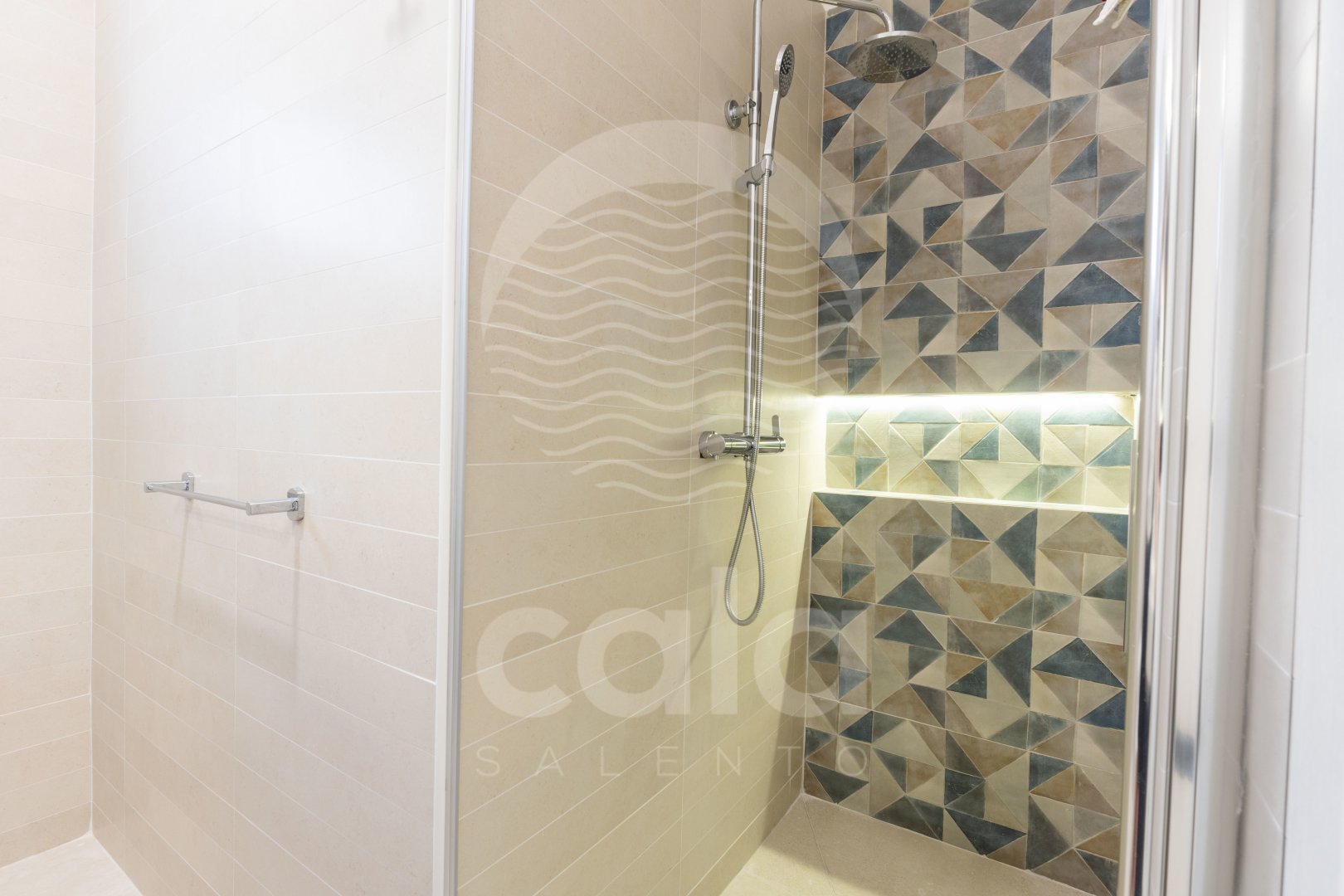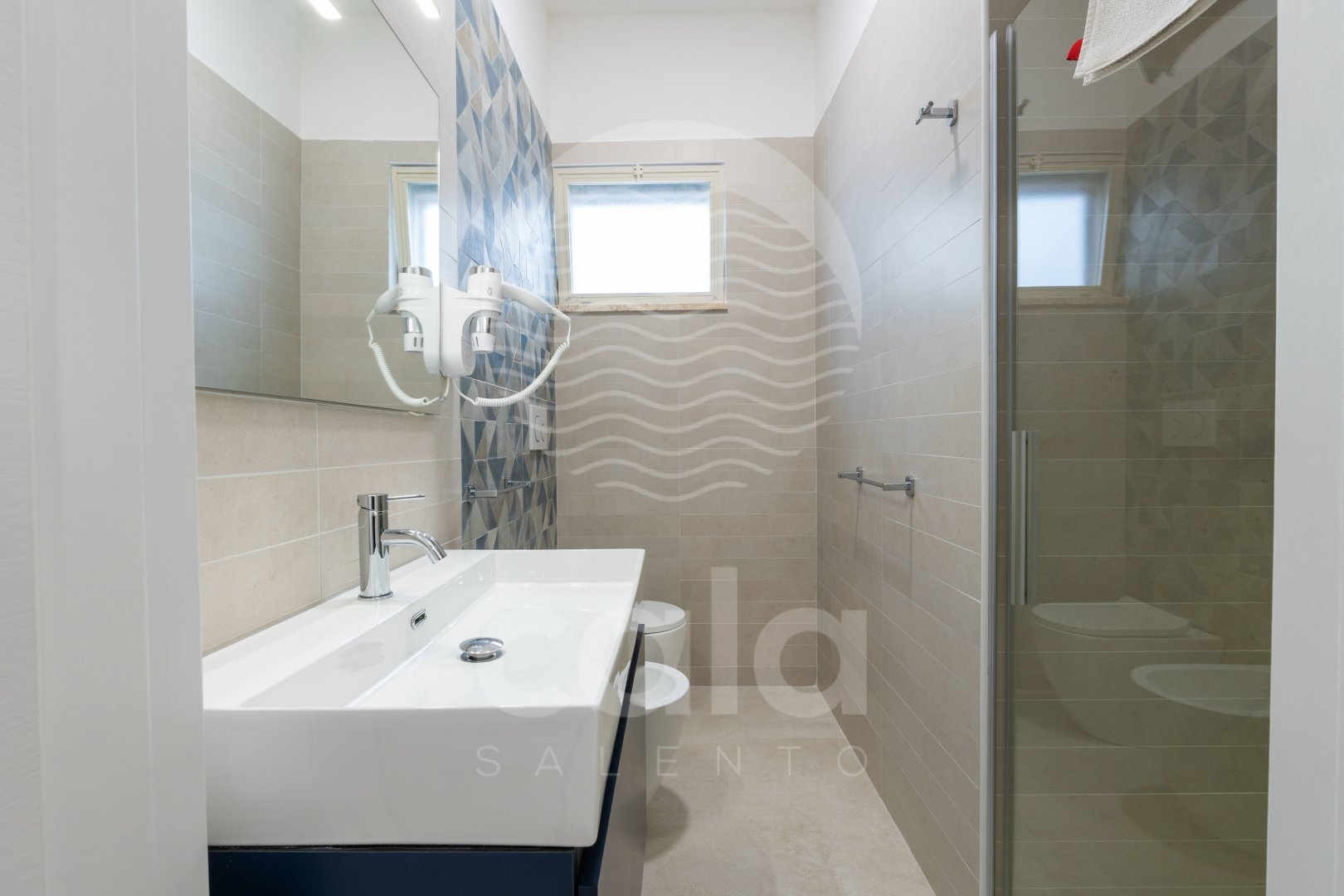 La salle de bain moderne et fonctionnelle comprend une grande douche, un lavabo avec meuble de rangement et un sèche-cheveux pratique.