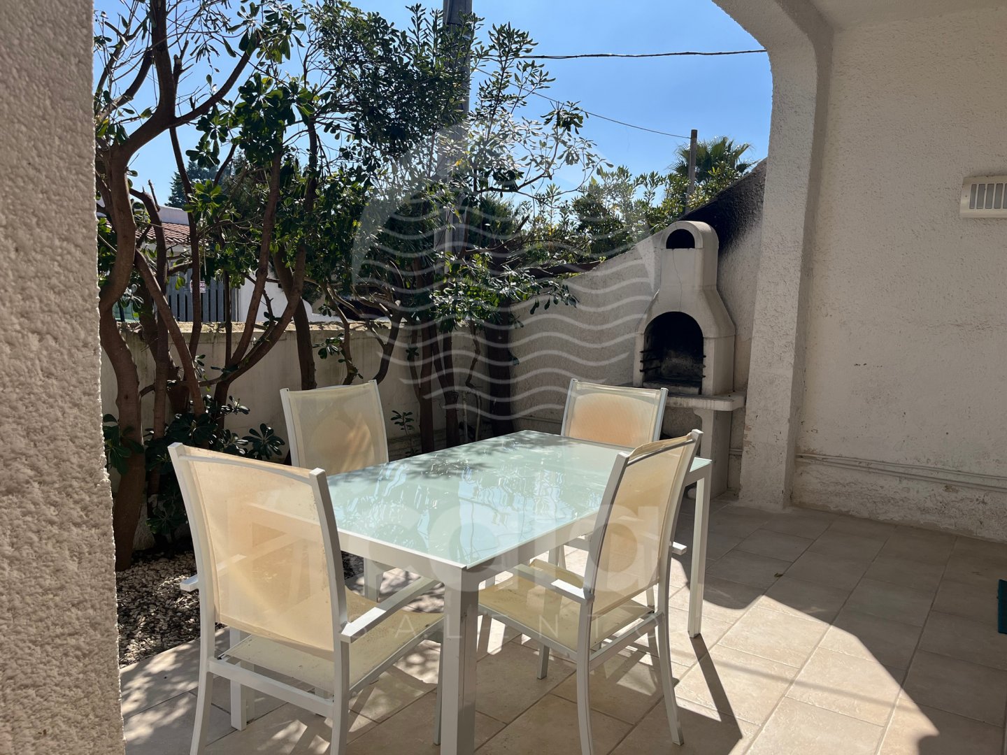 Véranda meublée avec table, chaises et barbecue, parfaite pour profiter des soirées en plein air