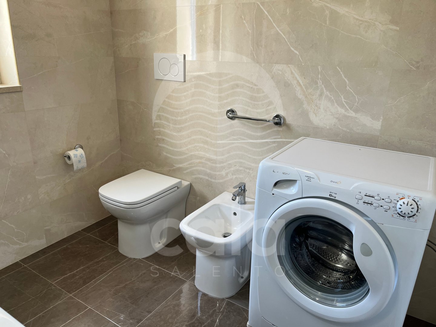 Salle de bain complète : cabine de douche, sanitaires et lave-linge