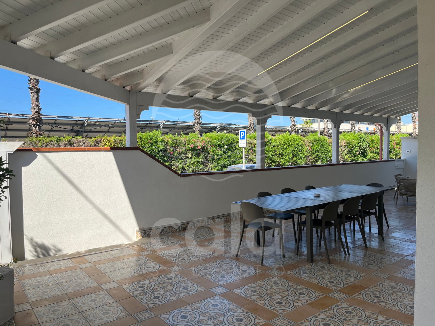 Terrasse équipée avec gazebo, table et chaises pour profiter de la vue sur la mer