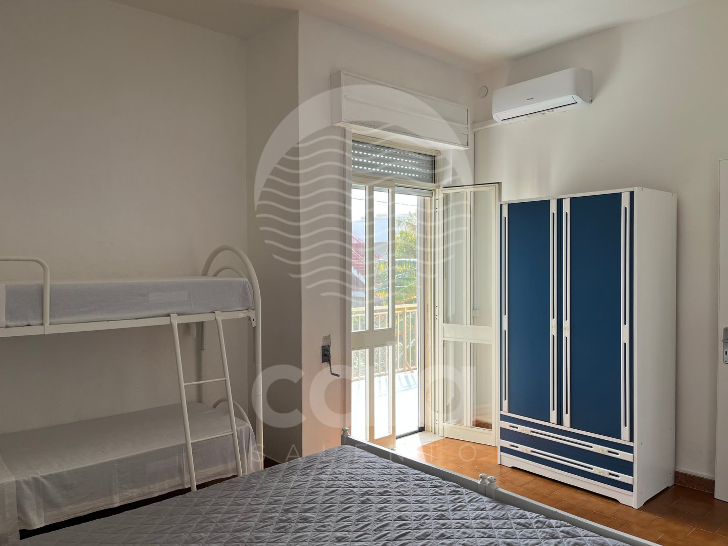 SISTEMAZIONE PER LA NOTTE: 1° camera climatizzata con letto matrimoniale più letto a castello, 2 ° camera con due lettini singoli. Bagno in corridoio completo di servizi, box doccia e lavatrice.