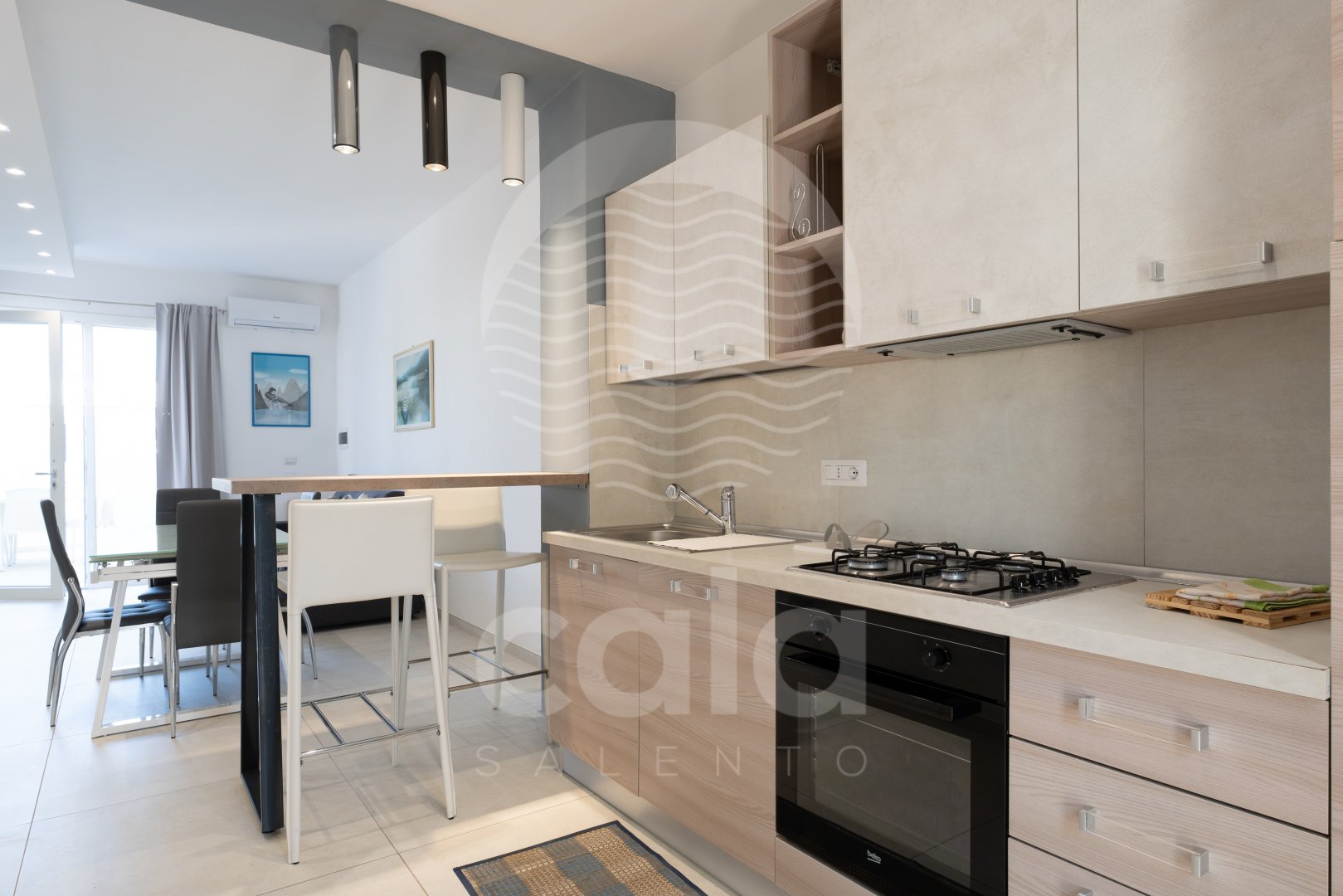 ZONA GIORNO: ingresso/soggiorno climatizzato, arredato in stile moderno con tavolo e sedie da pranzo, TV, divano letto matrimoniale, angolo cottura open space completo di frigo, forno, piano cottura a gas, lavastoviglie e stoviglie.