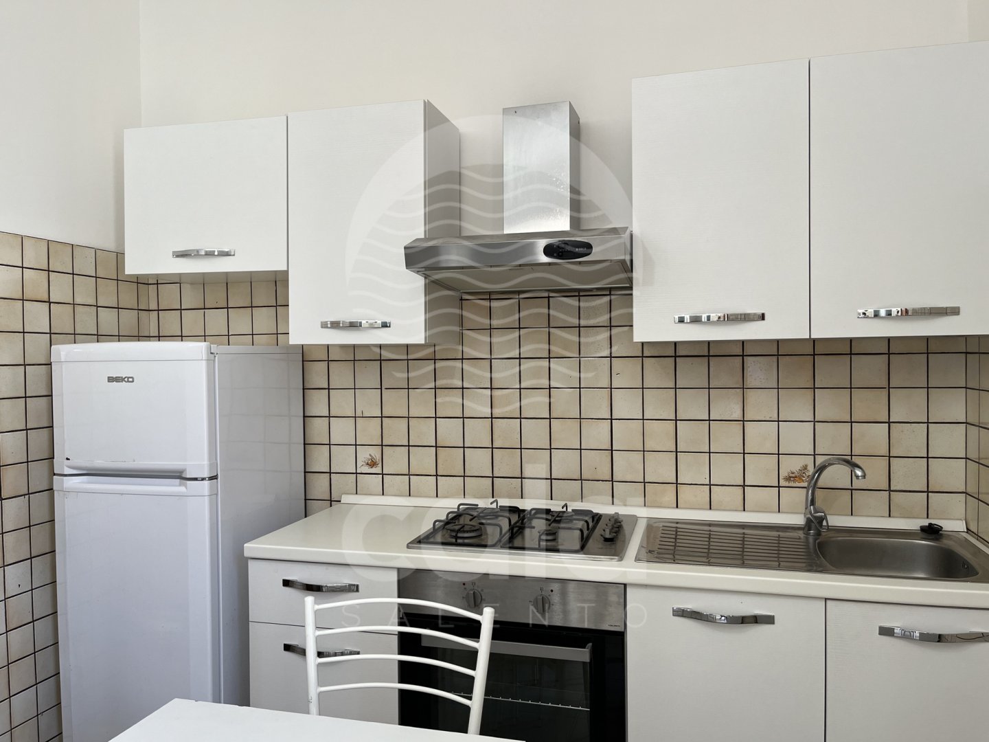 ZONA GIORNO: angolo cottura completo di forno, frigo e stoviglie, tavolo e sedie da pranzo.