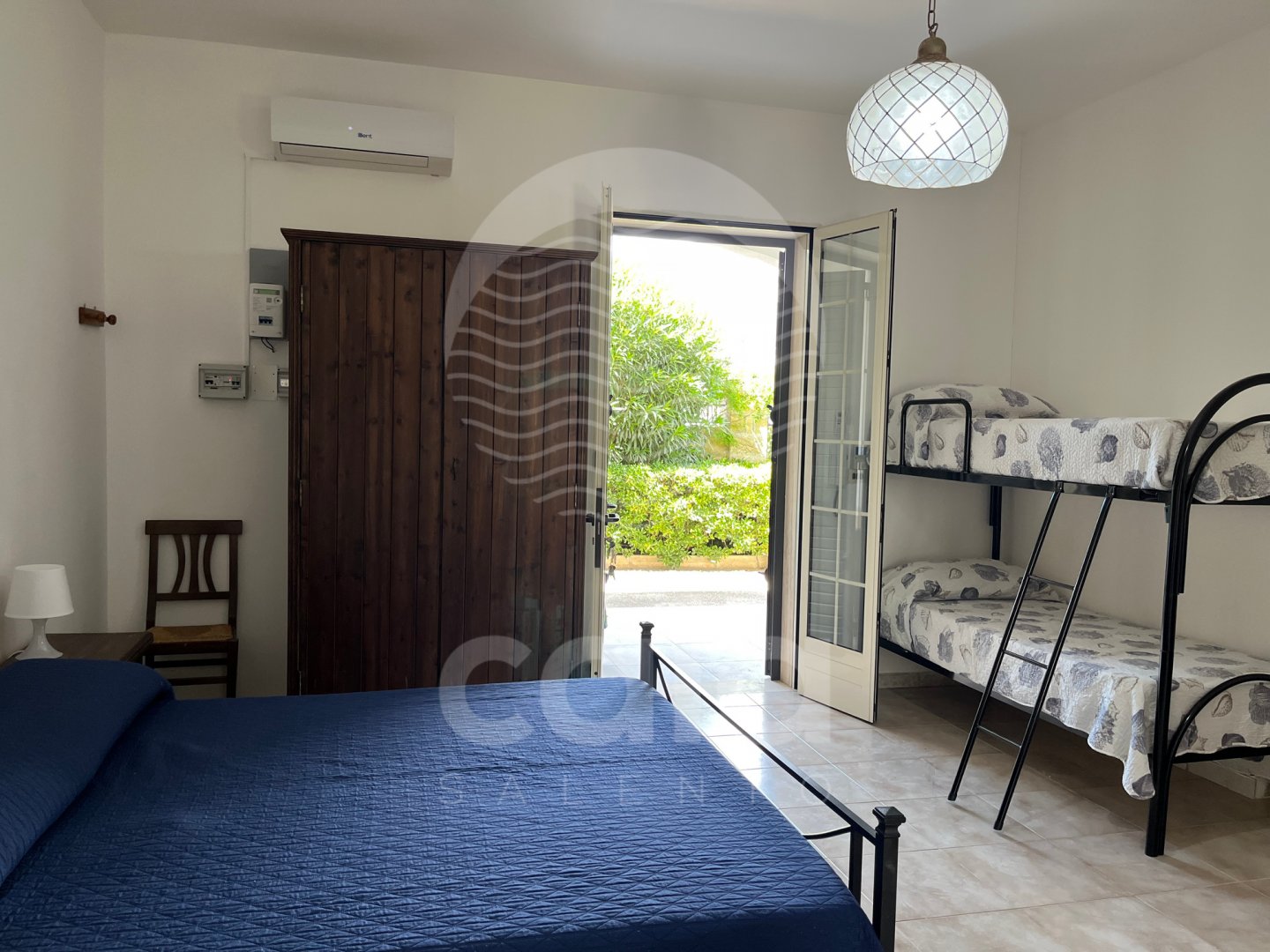 SISTEMAZIONE PER LA NOTTE: camera climatizzata con letto matrimoniale più letto a castello e TV (un pieghevole a disposizione). Bagno completo di servizi e box doccia.